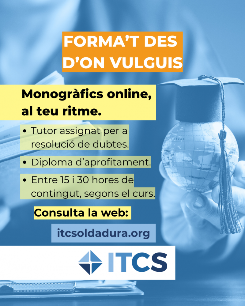 Aquests cursos s'imparteixen via Moodle, de manera asincrònica. Cada curs presenta el contingut dividit en diversos temes. En acabar cadascun d'ells hi ha tests d'autoavaluació opcionals i un examen final obligatori per a obtenir el diploma d'aprofitament. Per a realitzar la inscripció ho pots fer a través de la botiga online, o bé escriu-nos a: format@itcsoldadura.org.